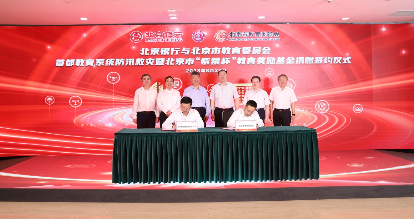 北京银行向北京市教育委员会捐赠防汛救灾资金1000万元,用于支持灾后恢复重建工作,并将累计出资1350万元,继续支持北京市“紫禁杯”教育奖励基金。