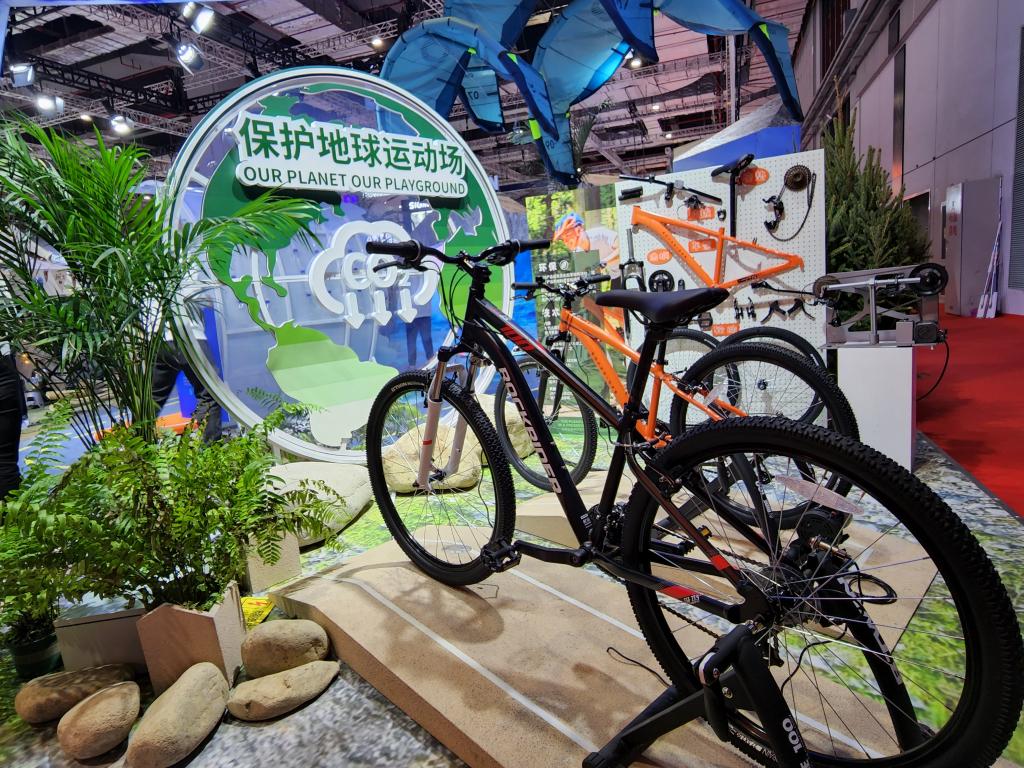 第五届进博会消费品展区迪卡侬的全球首发新品——生态设计山地自行车。新华社记者 王默玲 摄
