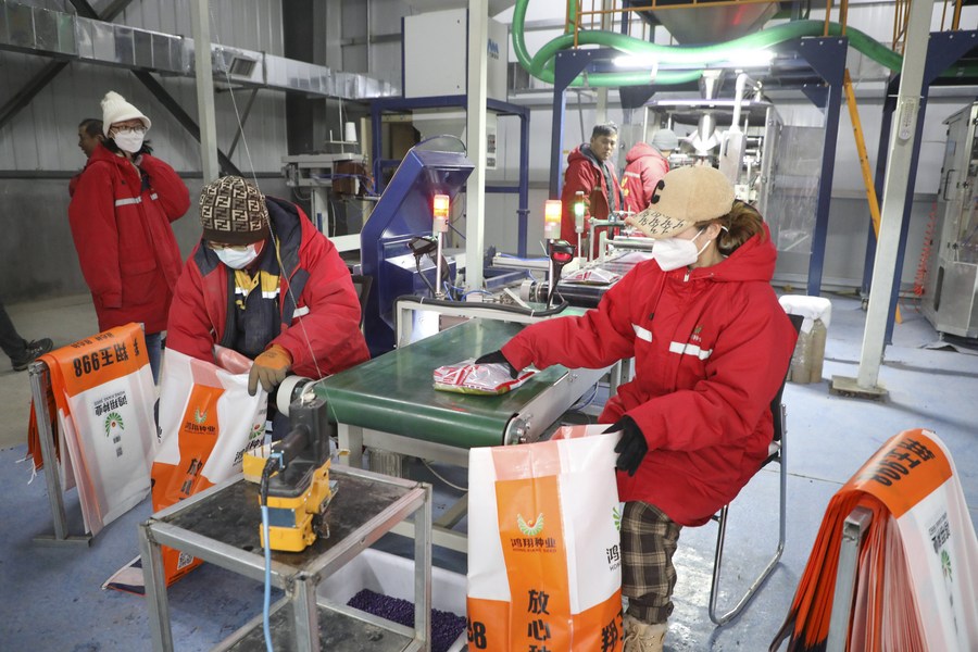 吉林省公主岭市鸿翔种业的工作人员在生产车间内分袋打包玉米种子产品(2月1日摄)。新华社发