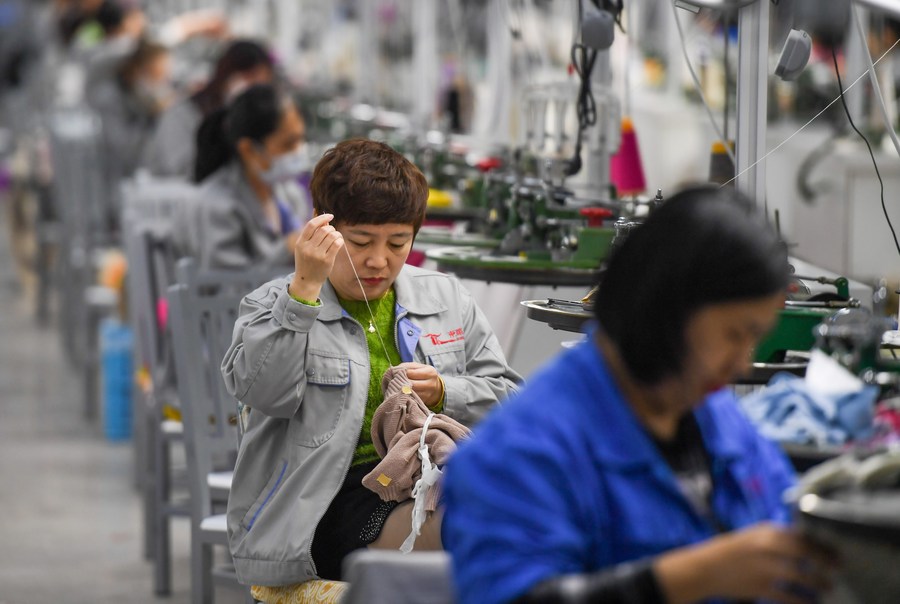 2月2日,赤峰东黎羊绒股份有限公司的工人在生产线上工作。新华社记者 彭源 摄