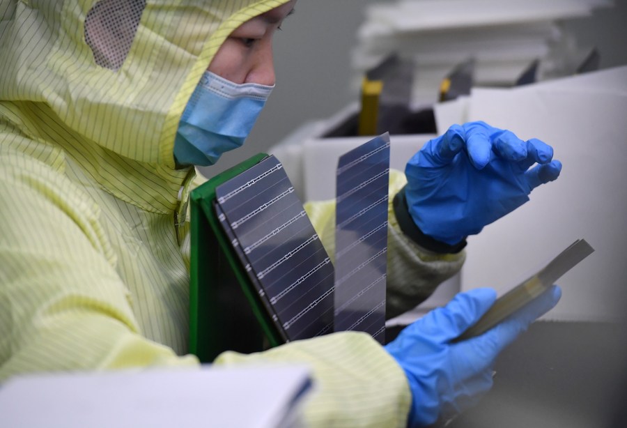 2月2日,检验人员在隆基绿能高陵电池工厂检查电池片。新华社记者 邵瑞 摄